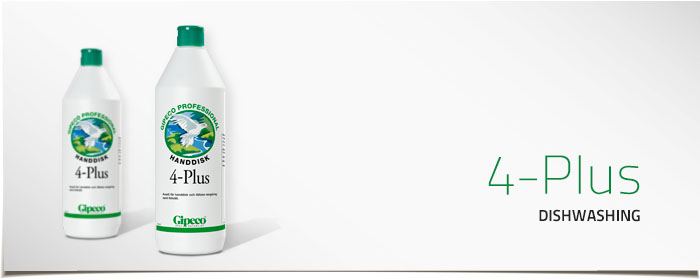 4 Plus is an economical and efficient hand dishwashing agent for self-drying dishes. Efficient even in hard water. 4 Plus has an especially mild effect on skin and materials.