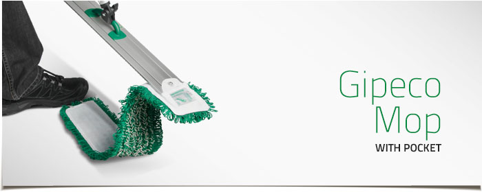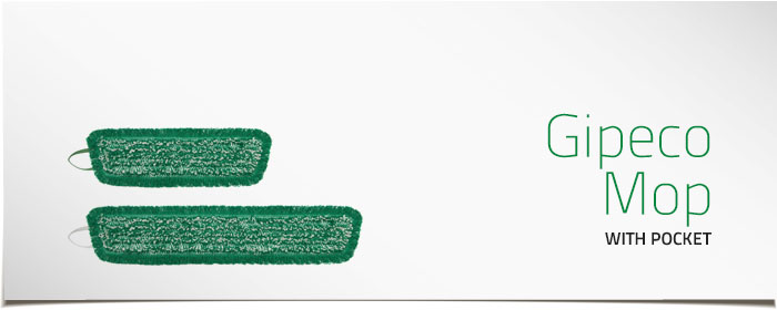 The upper side has a guiding pocket and an eyelet on velcro velour. Adapted for the Gipeco Mop Head, Art. No. 430380/60 cm and 430385/40 cm. The mop does not require removing from the mop head for wringing in a mop/swab press, it remains hanging from the guide pocket due to the eyelet fastening.