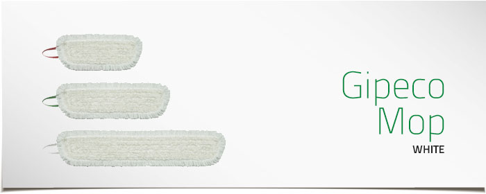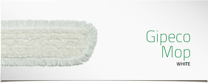 An efficient and durable damp/wet cleaning mop with excellent material quality. A unique combination of short cotton/synthetic loops in varying sizes, sewn onto the reverse side of a velcro velour length with a looped edge fringe. The unique design gives Gipeco Mop a superior moisture absorption and dirt-attaching performance. Liquid is evenly distributed over the entire surface being cleaned.