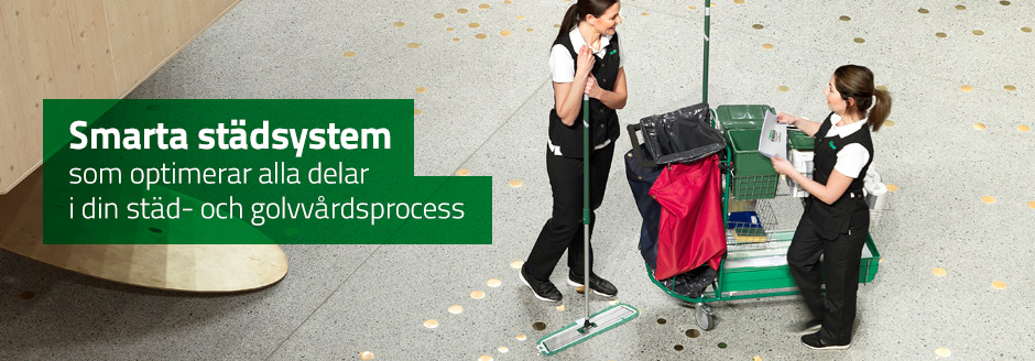 Det har vi gjort med våra städsystem. Här har vi tagit hänsyn till hur olika behandlingar påverkar varandra, vilka effekterna blir på kort och lång sikt samt hur medel och material samverkar. I systemen har vi vägt in allt som påverkar städkvalitet, ergonomi, effektivitet och ekonomi så att allt samverkar i perfekt harmoni.